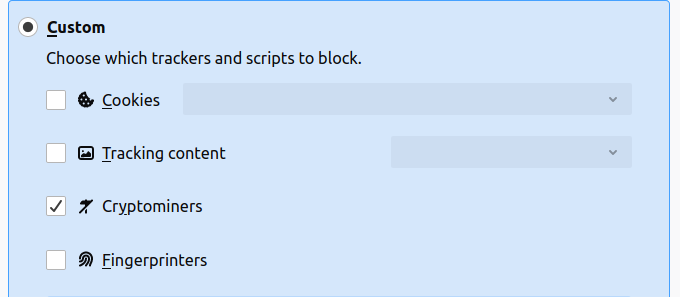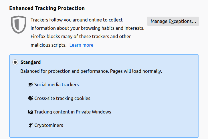 For most of these trackers, Firefox helpfully pointed out that it would have blocked them if I was using the standard Firefox privacy settings: